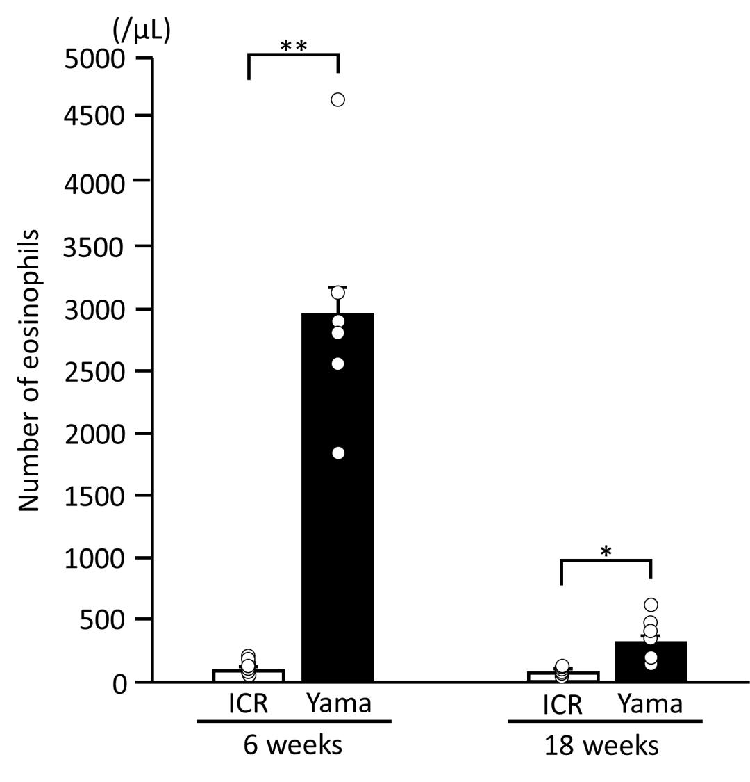 Figure 1 presents the number of eosinophils in the peripheral blood of 6- and 18-week-old ICR and Yama mice. The number of eosinophils in the peripheral blood of 6-week-old Yama mice was 30-fold higher than that of 6-week-old ICR mice. The number of eosinophils in 18-week-old Yama mice decreased to approximately 1/10 of that in 6-week-old Yama mice, but was still 4-fold higher than that in 18-week-old ICR mice.