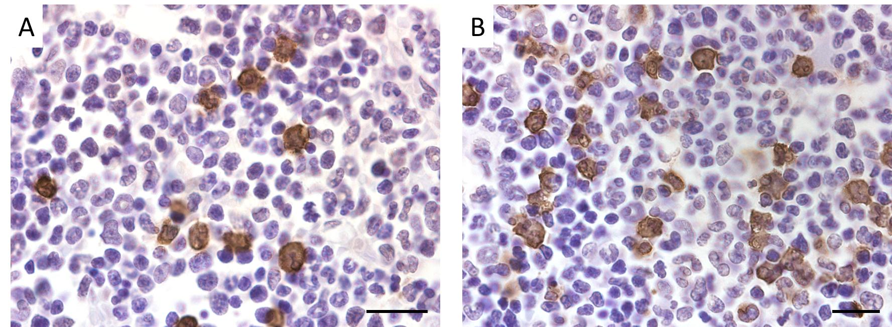 Eosinophils were identified by a segmented nucleus and cytoplasmic eosinophilic granules in H & E staining of bone marrow samples (Figure 2) and confirmed by immunopositivity in ECP immunohistochemistry (Figure 3). In H & E staining and ECP immunohistochemistry, eosinophils were more numerous in Yama mice than in ICR mice. The percentage of eosinophils in ECP immunohistochemistry of bone marrow was significantly higher in Yama mice (7.93 ± 2.34%) than in ICR mice (3.54 ± 0.43% [Figure 4]). Hyperkeratinization was observed in the squamous epithelium of the stomach of 6-week-old Yama mice, but no lesions were observed in the other organs examined histologically.