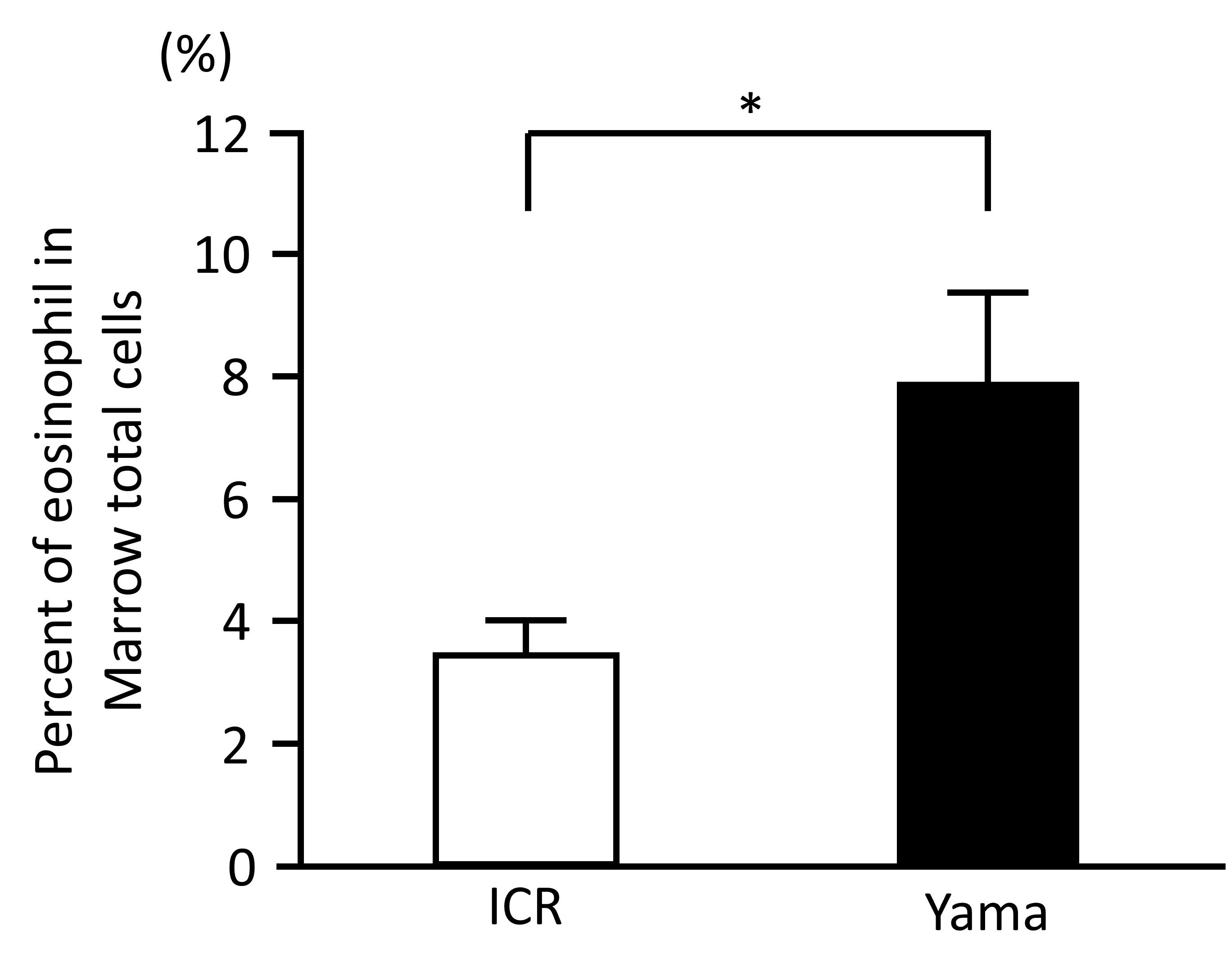Blood samples were collected from 6- and 18-week-old ICR and Yama mice. Briefly, each mouse was anesthetized by intraperitoneal injection of a mixture of 10 mg/kg xylazine (Bayer, Tokyo, Japan) and 80 mg/kg ketamine (Daiichi Sankyo Co., Ltd., Tokyo, Japan). Blood was collected from the retro-orbital sinus using a capillary tube (AS ONE Corporation, Osaka, Japan). Whole blood samples were collected from the mice after anesthesia. Serum samples were obtained after centrifugation (3000 rpm, 10 min). For tissue sampling, mice were euthanized by cervical dislocation when 6-weeks old, and the organs (stomach, small intestine, large intestine, liver, heart, lungs, kidneys, spleen, bone marrow and mesenteric lymph nodes) were immediately removed. RNA was extracted from the spleen, bone marrow and mesenteric lymph nodes and subjected to a reverse transcription-quantitative polymerase chain reaction (RT-qPCR). Organs were fixed in 10% neutral-buffered formalin (Sigma Aldrich, St Louis, MA, USA) for histopathological examination. After fixation, the unilateral femur was decalcified with 0.5 M ethylenediaminetetraacetic acid (EDTA solution [Sigma Aldrich]) at pH 7.0 for 24 h for histopathological examination of the bone marrow. The samples were then routinely embedded in paraffin, and 4-µm-thick sections were prepared for hematoxylin and eosin (H & E) staining (Abbey Color Inc., ST Tioga, PA, USA). Bone marrow sections were prepared for immunohistochemistry for counting eosinophils.