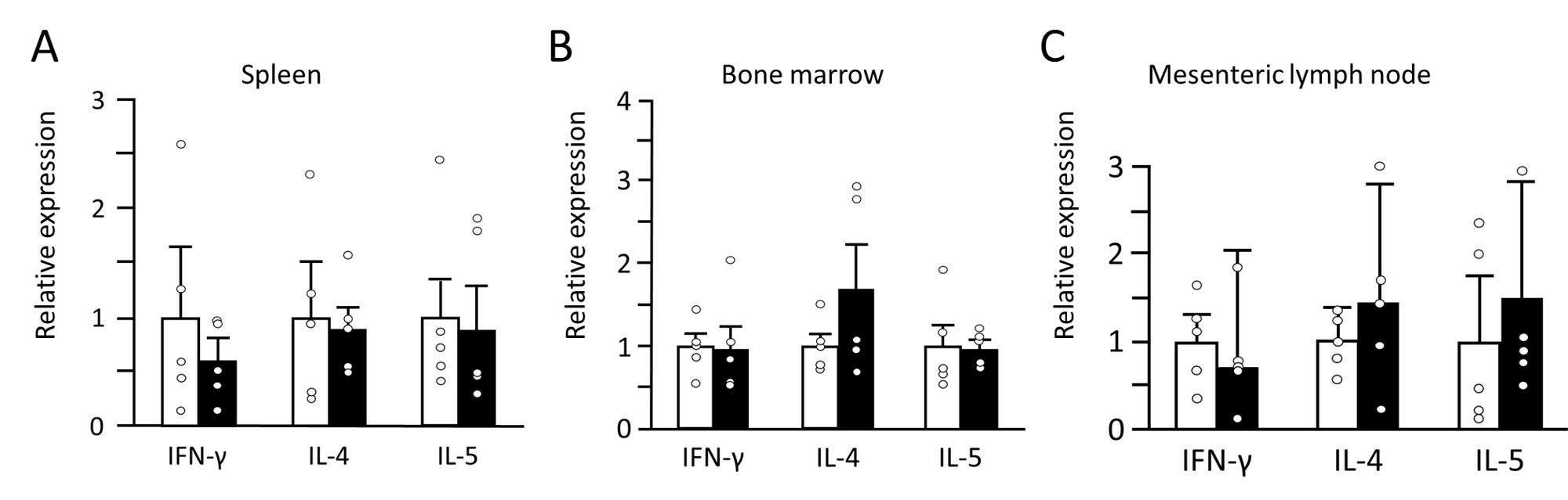 The mRNA expression levels of IFN-γ, IL-4 and IL-5 in tissues are presented in Figure 5. There was no significant difference between ICR and Yama mice in IL-5 IL-4 or IFN-y expression in the spleen, mesenteric lymph nodes or bone marrow. The serum IFN-γ, IL-4, and IL-5 levels are presented in Figure 6. The levels of all these cytokines in the serum were not significantly different between ICR and Yama mice. The Th1 to Th2 ratio in the serum of ICR and Yama mice was approximately 1:1.15 and exhibited almost the same value.