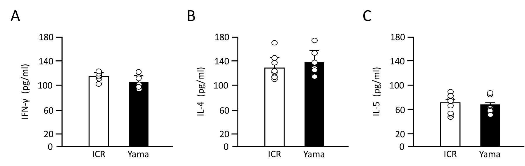 Serum IFN-γ, IL-4 and IL-5 from ICR and Yama mice was quantified using an ELISA kit (IFN-γ, IL-4: Cosmo Bio Co., Ltd., Tokyo, Japan., IL-5: Funakoshi Co., Ltd., Tokyo, Japan) according to the manufacturer’s instructions. Expression levels of the cytokines were determined by comparison to a standard curve generated by serial dilution of manufacturer-provided standard. The T helper 1 (Th1) to Th2 ratios were calculated by IFN-γ/IL-4 in ICR and Yama mice.