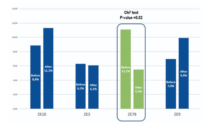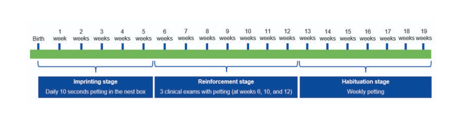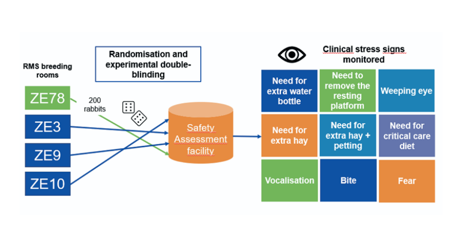 Rabbits, as a species, are naturally very sensitive to stress which is a source of complications for the work done with these animals in laboratory settings; both in terms of their interaction with humans, and regarding the quality of the scientific research results. The project started in 2020 as part of our strategic goals for animal welfare. Our objective was to make our rabbits more habituated to humans for less stress and better science. This objective also fits with our Culture of Care ambition: if rabbits feel more relaxed, it will also have a positive impact on the technicians who handle them and on the quality of science. In order to have a holistic approach for positive human-rabbit bonding to reduce stress and increase animal welfare, we designed a rabbit/human habit- uation protocol during the breeding and husbandry cycle, from birth all the way to when we transport the animals to our client’s experimental facility. The effect of this protocol was monitored with several clinical stress indicators evaluated during acclimati- sation period following delivery to the clients facility (Figure 2). The clinical stress indicators were chosen based on our previous experiences during acclima- tization and publications such as Jeffrey R. Jenkins, 2001. The clinical stress indicators were mostly scored with a yes score = 1 or a no score = 0, although moderated according to severity of the clinical signs and with the clinical stress indicators “Vocalisation”, “Need for extra hay + petting” and “Fear” with a yes score = 2 and “Bite” with a yes score = 3. The study was designed with a double-blinded randomized protocol with the rabbits evaluated coming from 4 different breeding areas but with the habituation pro- gramme implemented in only one area (ZE78). Eval- uators at the clients facility were blind with respect to which area the animals were supplied from. The first of the three habituation programme steps (Figure 3) is based on the imprinting theo- ries from Konrad Lorenz with birds. We postulated that the earlier in life we habituate our rabbit pups to human contact, the easier it will be in the future. Also, we do not change the gloves between cages to habituate them to the different odors from other litters. Each nest box is visited every day, for 10 sec- onds, with the technician gently stroking the pups from birth to weaning. The second step is reinforcement with 3 clinical examinations between Weeks 6 and 12. The clinical examination is a specific part of the acclimatisation routine and includes a physical examination and a stress assessment. In addition, it is also implemented to create bonds between the rabbits and the animal technicians before starting the habituation stage. Each examination is followed by a positive reinforce- ment of petting session. This is the first time the rabbits are manipulated outside of the cage for the habit- uation. The last step occurs between Weeks 13 and 19 with individual petting without constraint, on a weekly basis. The animal technician takes the rabbit in his arms with calmness and assurance. He holds the rabbit against the chest, then strokes it for 10 sec- onds before gently returning it back to the cage. This last step is mainly performed on females as males are not kept after 12 weeks of age and the females are usually not kept after 19 weeks (see Figure 3).