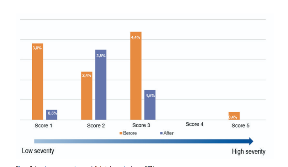 The impact of this habituation is quantitative but also qualitative as we were able to remove all signs associ- ated with human fear such as biting associated with aggressive behaviour and significantly reduced the severity of remaining scores. We were also informed by our client that they feel much more comfortable with the rabbits and that the number of animal wel- fare events are reduced. Due to the conclusive out- come, the programme was subsequently implement- ed in all 4 breeding areas and is now standard prac- tice at the facility.